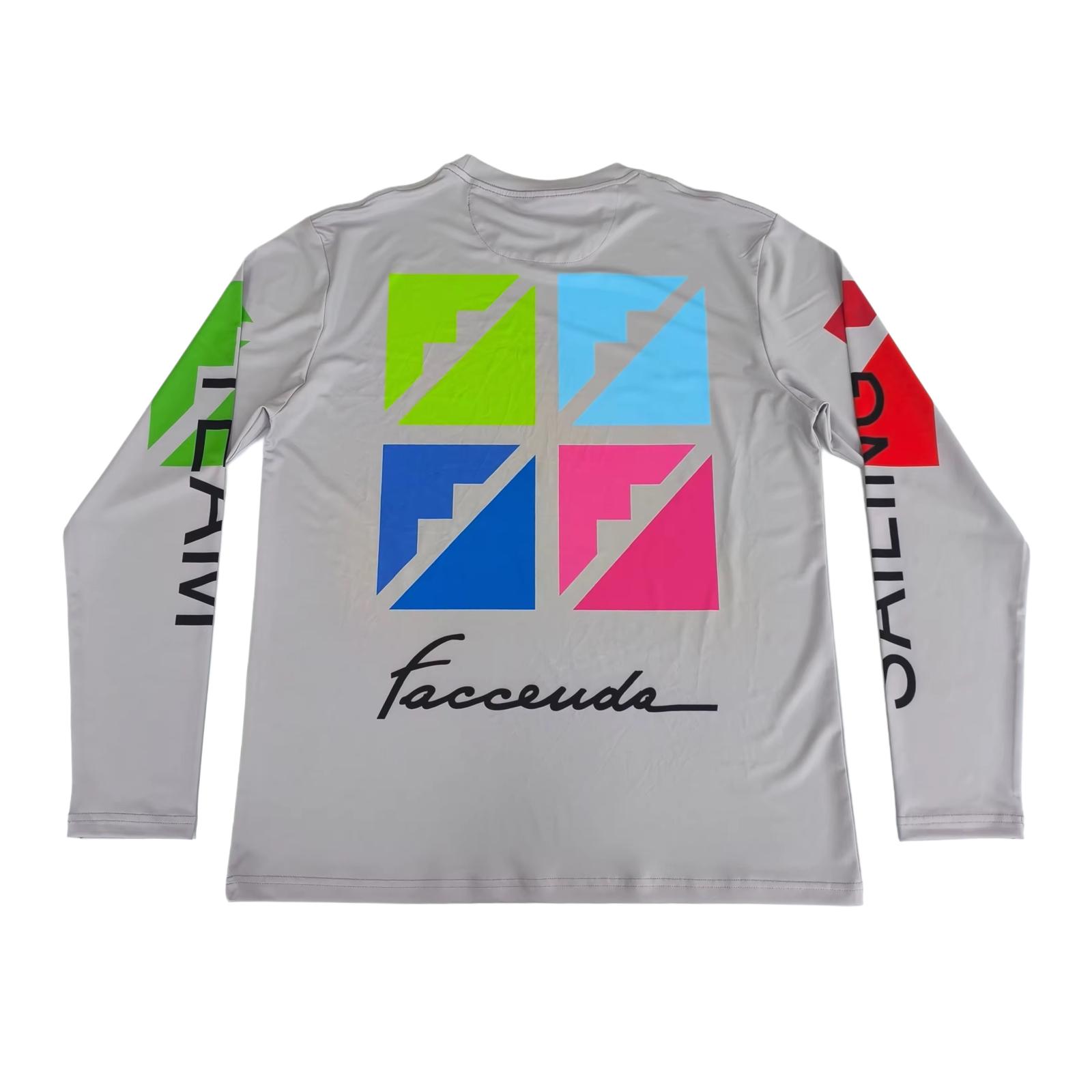 Il colore chiaro con loghi Faccenda multicolor in serigrafia richiama lo stile energico e distintivo del brand, mentre la vestibilità ergonomica segue il corpo senza costringere, garantendo massima comodità.
